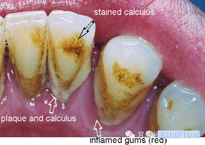 洗牙就是把牙齿上沾染的脏东西去掉,这个脏东西主要指色素和牙石。色素就是图一上边那个箭头所指的,牙石是图一左下那个箭头所指的。